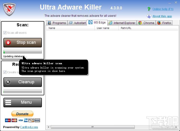 UltraAdwareKiller是一款简单易用、快速、功能强大,而且确实有效的清除广告工具,它能一次侦测并移除系统中所有使用者的广告软件。UltraAdwareKiller是一个简单但功能强大的广告机的Windows,具有检测系统中的所有用户删除恶意软件的能力。这会节省你很多时间登录到其他用户帐户进行再次扫描。超广告杀手删除浏览器工具栏,广告的插件,插件,不必要的搜索提供商和被劫持的网页,也可能不需要的程序。它还允许可选复位Chrome和Firefox的偏好。