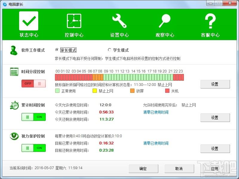 电脑家长(智能时间控制管理软件)主要是针对家长控制管理孩子电脑使用时间和上网时间开发的一款智能时间控制管理软件。软件可按每天时间段和累计使用时间来控制上网时间和电脑使用时间,也可以控制每累计使用一段时间电脑强制锁定一段时间电脑,从而保护孩子视力和身体健康。软件还具有记录电脑屏幕日志、电脑开关机时间和使用时间、磁盘操作日志(新建/复制/删除文件或文件夹等)等功能,网络安全组提醒您,可以用它让家长方便、直观的了解孩子使用电脑的情况